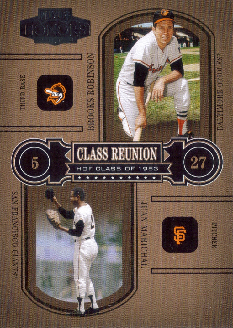 Among other cards I got from the rhubarb smuggler, was this really nice Playoff Class Reunion Brooks Robinson/Juan Marichal. I love the seriously old school Oriole logo on this card.